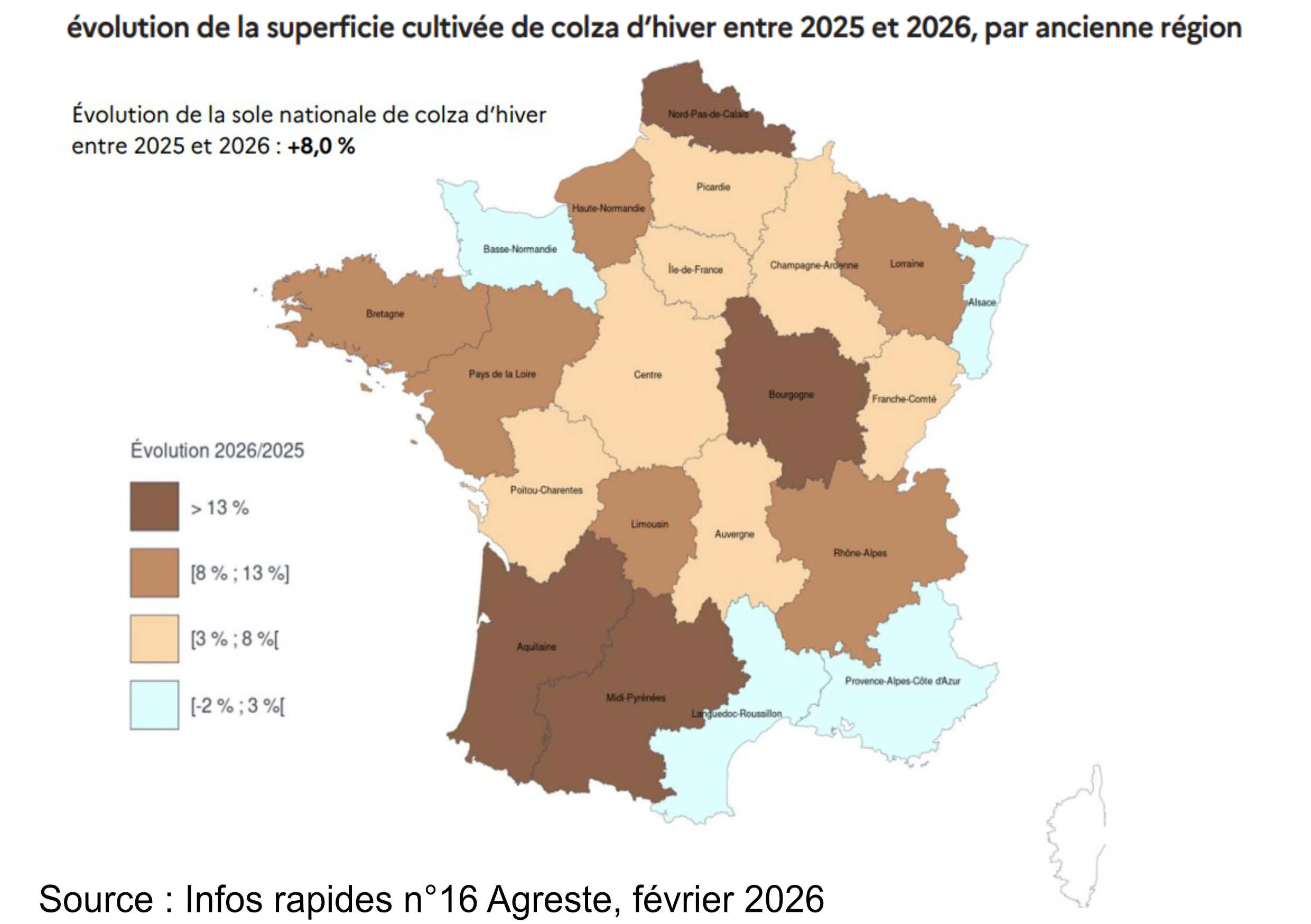 Les surfaces progresseraient de 8 % sur un an et seraient en hausse dans la quasi-totalité des régions. Le rebond concerne aussi bien les zones historiques de production que les régions où le colza avait reculé ces dernières années. Les progressions les plus marquées sont attendues dans le grand Sud-Ouest et le Nord de la France, avec des niveaux supérieurs de plus de 40 % à la moyenne des campagnes 2021 à 2025.
