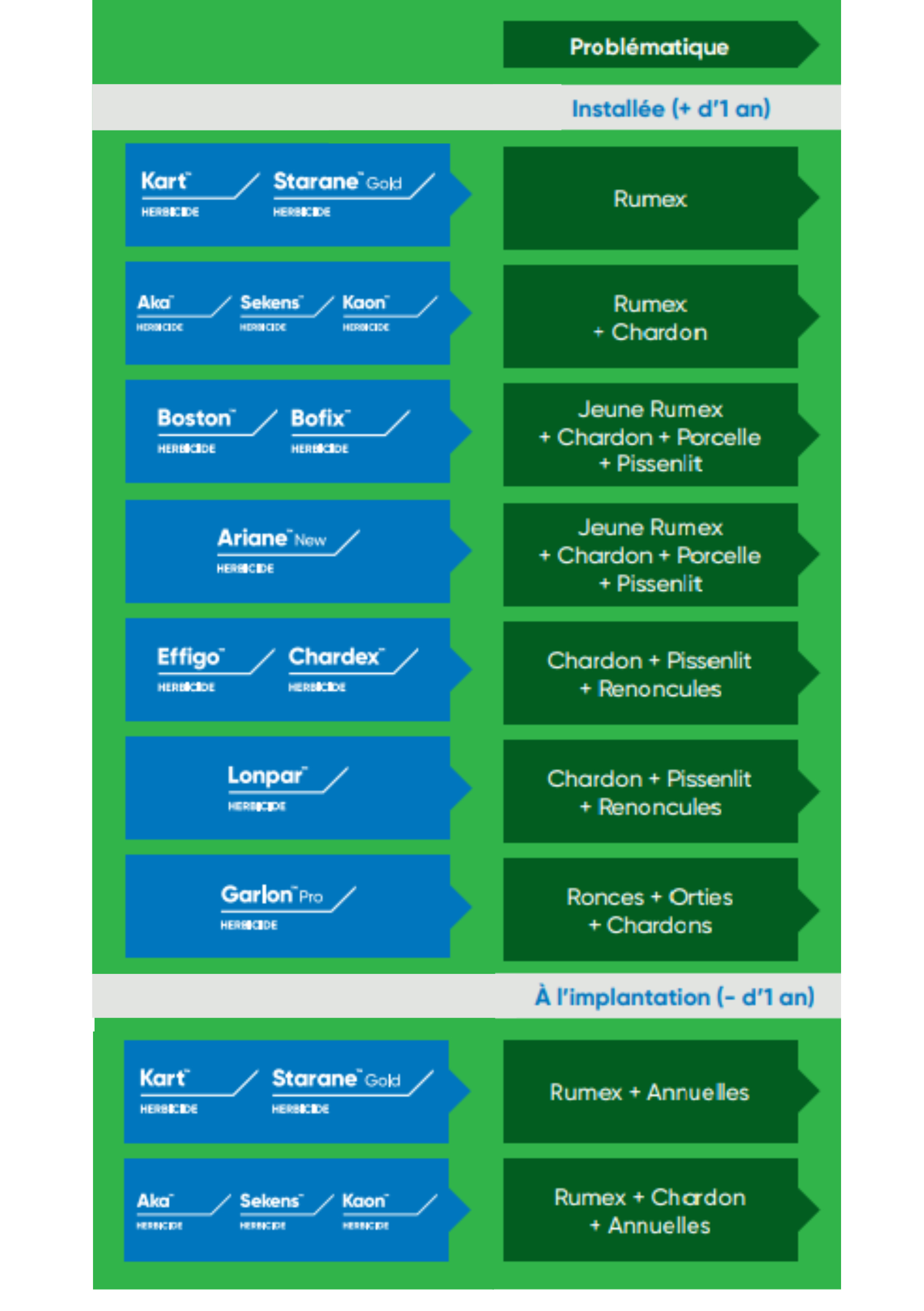 Plusieurs solutions herbicides permettent aujourd’hui de cibler efficacement ces adventices en prairie. Pour la gestion du rumex, des spécialités comme Bofix, Kaon, Ariane New ou Kart peuvent être mobilisées. Dans le cas du chardon, des références telles que Bofix, Chardex, Ariane New ou Kaon offrent des niveaux d’efficacité intéressants. Le choix doit toujours être raisonné en fonction de la flore présente et du stade d’intervention.