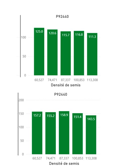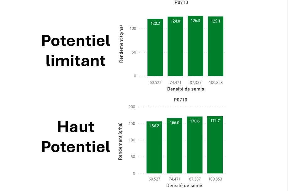 Ces essais sont réalisés en micro‑parcelles en plein champ, avec cinq densités (de 60 000 à 120 000 plantes/ha) et différents écartements entre rangs (40 ou 80 cm). Les résultats permettent d’observer le comportement des hybrides : certains épis tirent profit d’une densité plus élevée, tandis que d’autres épis plus flexibles maintiennent leur rendement malgré des densités de semis relativement basse.