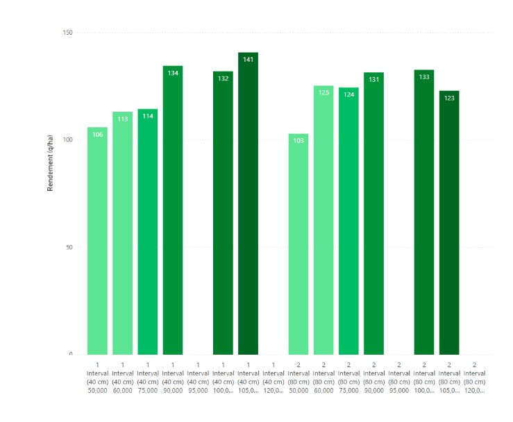 La combinaison de l’espacement entre les rangs (40 ou 80 cm) et de la densité de semis montre qu’il y a des plages optimales pour certains hybrides : comme sur cet essai, où le plus haut rendement a été atteint à 141 q/ha avec un espacement de 40 cm et une densité de 105 000 épis/ha.. Mais de bons résultats ont été obtenus à 80 cm et à 40 cm et plus de 90 000 épis/ha.