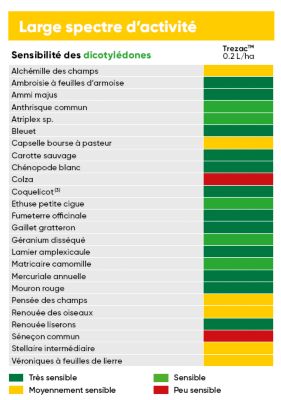 TREZAC™ : EC - concentré émulsionnable , contenant 25 Grammes par litre de Aminopyralid, 30 Grammes par litre de Cloquintocet-mexyl, 31.27 Grammes par litre de Halauxifène-méthyl. AMM N° 2190249 - Corteva Agriscience France S.A.S.